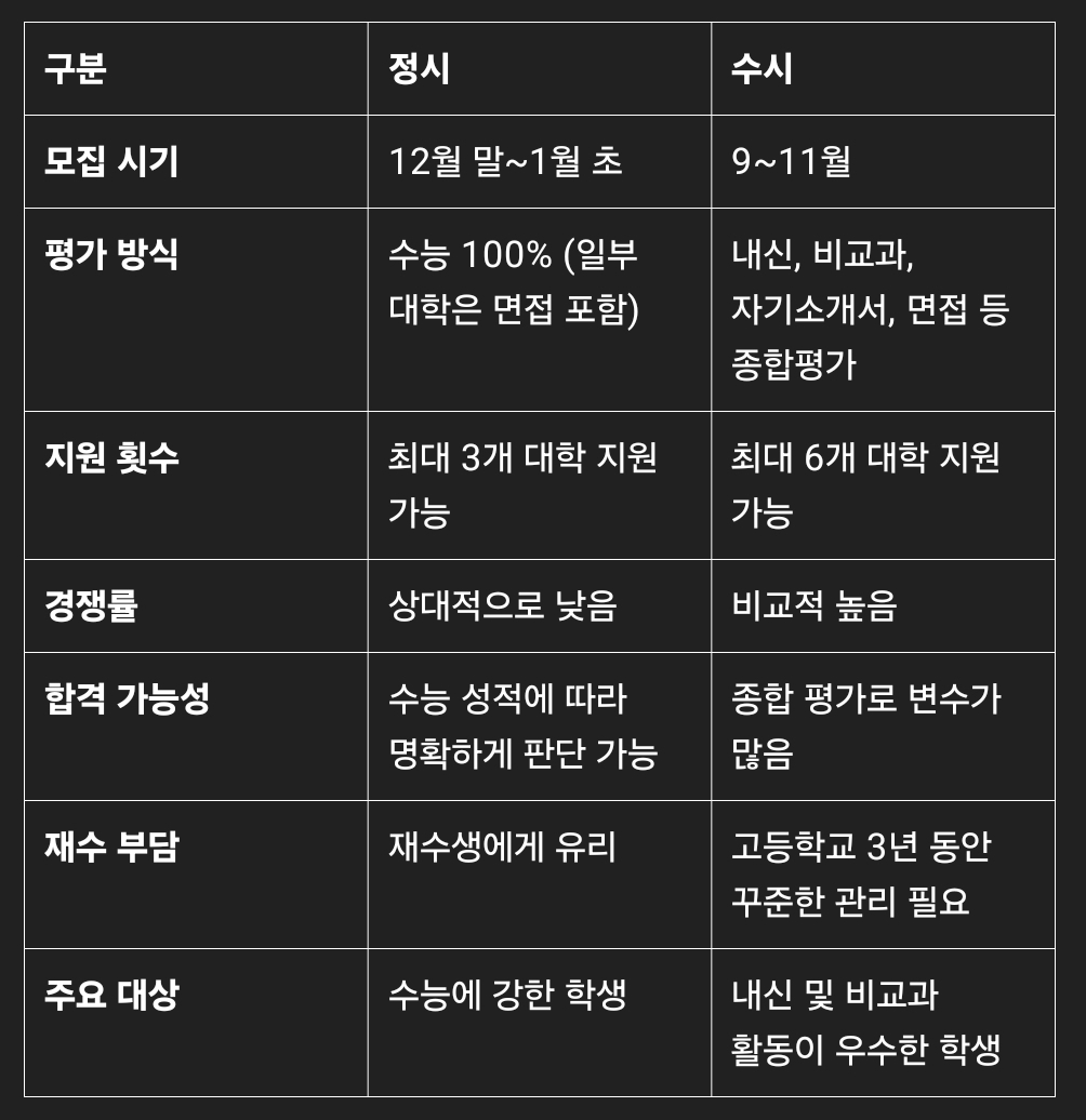 정시와 수시는 각기 다른 특징과 장점이 있으며, 개인의 학업 스타일과 목표에 따라 선택이 달라집니다.